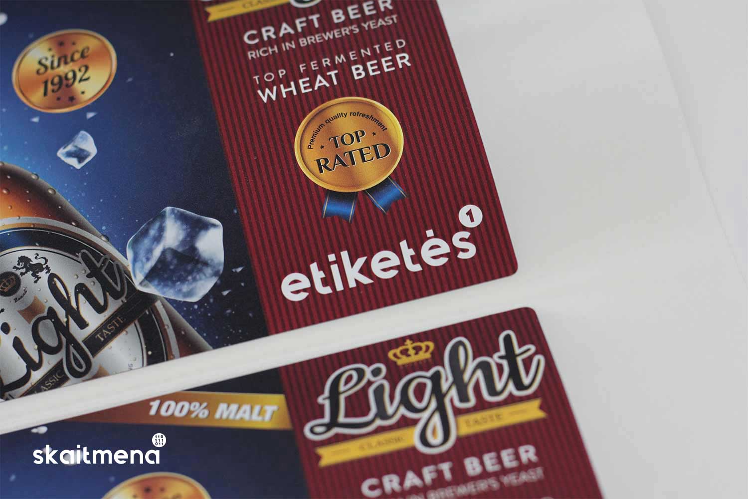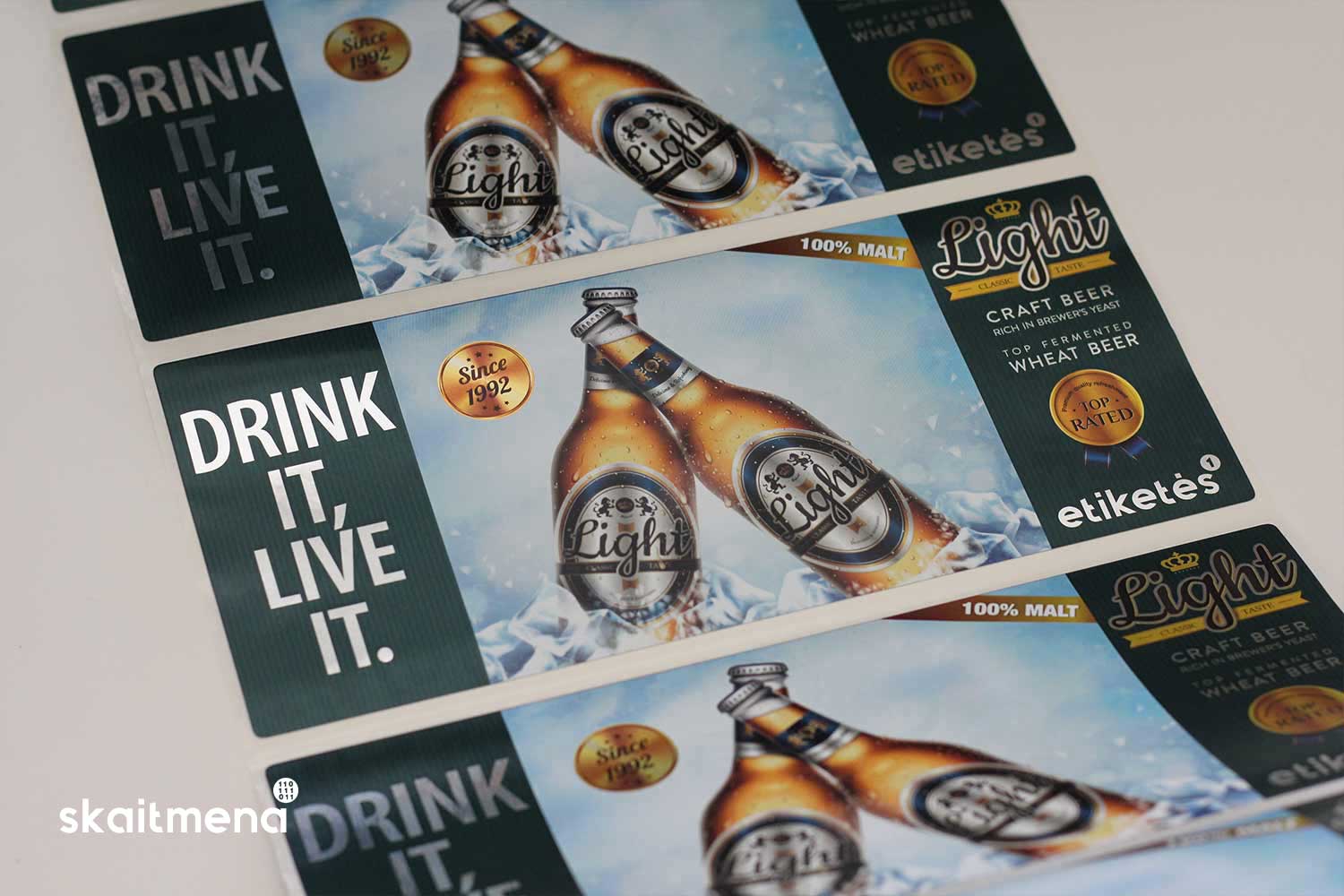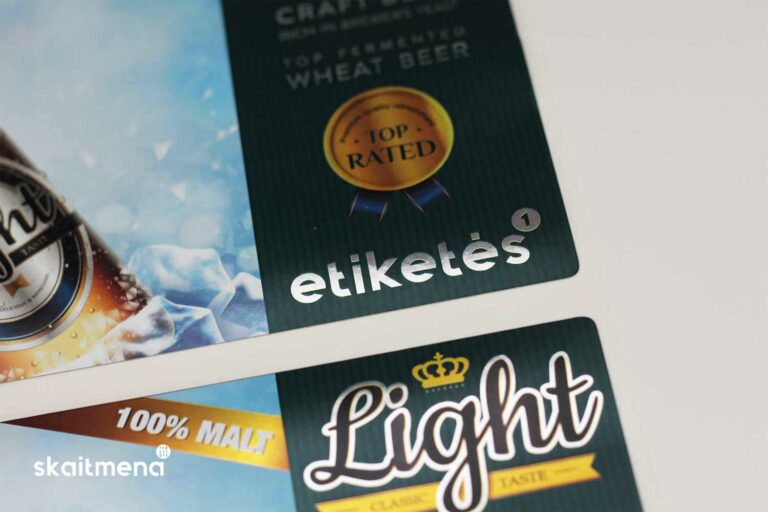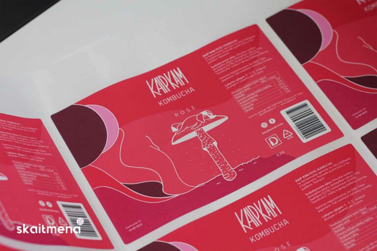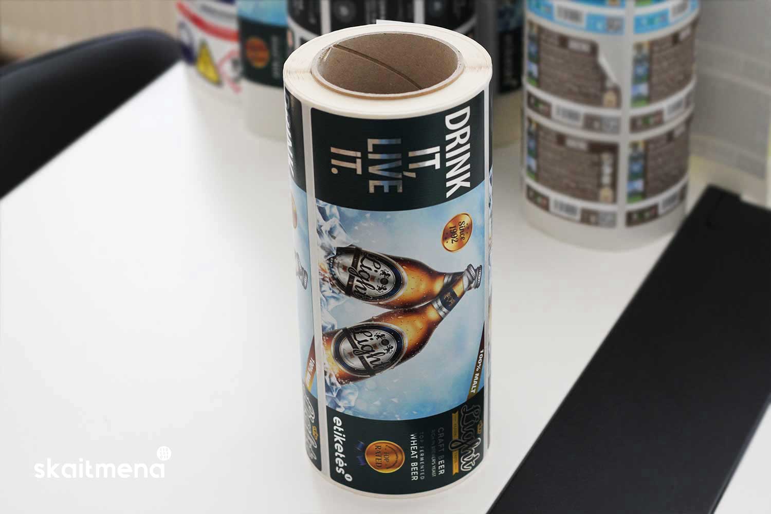 Līmējošās etiķetes mēs drukājam uz dažādiem plēvju veidiem. Visbiežāk tiek izvēlētas PVC līmējošās plēves, kas var būt caurspīdīgas, spīdīgas vai matētas. Mēs strādājam šajā jomā jau ilgu laiku, tāpēc iesakām izvēlēties spīdīgas plēves, tās mazāk netīrās, tādējādi jūsu produkts var palikt pievilcīgāks ilgāk. Citu marku atšķirību nav, tāpēc, ja nebaidāties, ka etiķete nosmērēsies, pielāgojiet materiālu atbilstoši savai līmējošās etiķetes maketai. Izvēloties plēvi, mēs varam uzsākt etiķešu drukāšanu.
