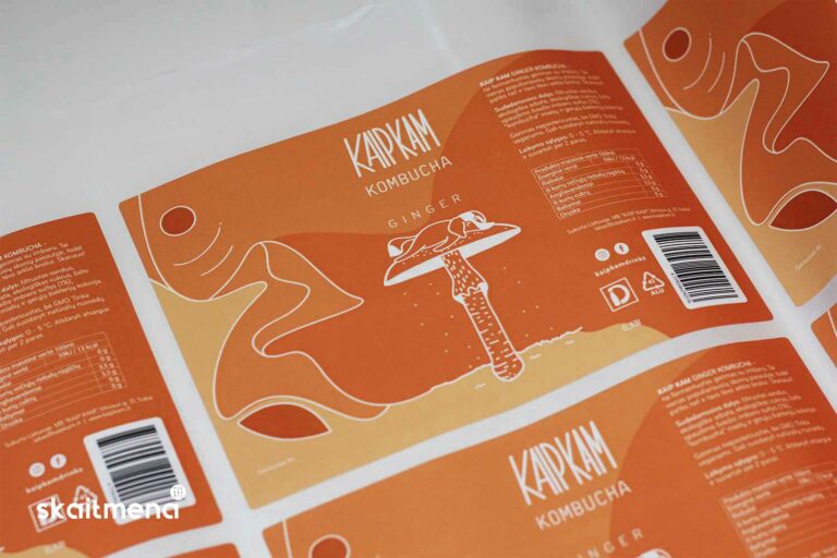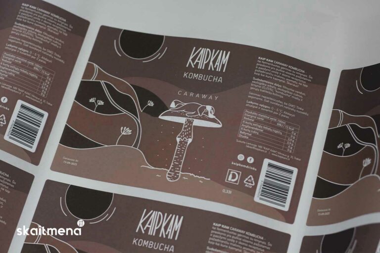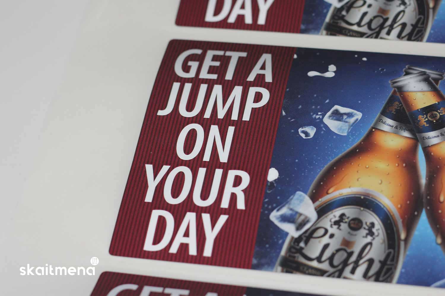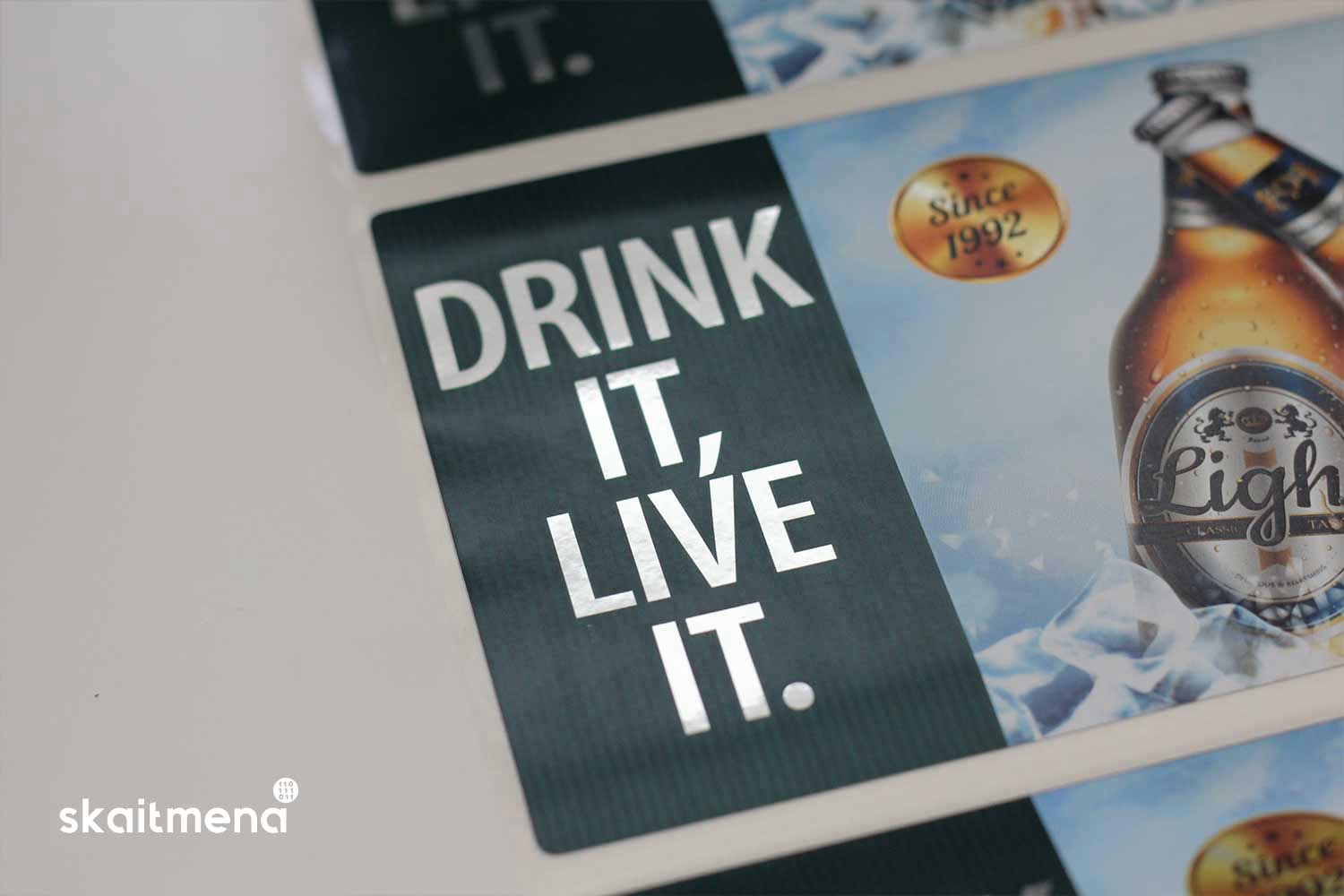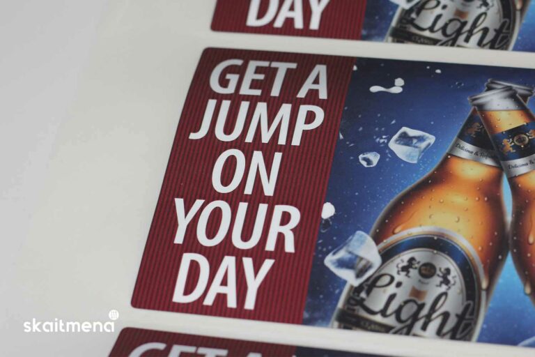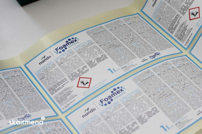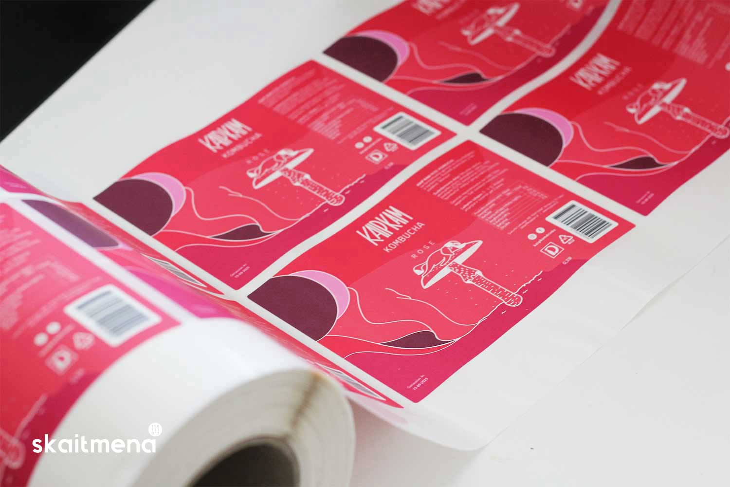 Līmējošās etiķetes mēs drukājam uz dažādiem plēvju veidiem. Visbiežāk tiek izvēlētas PVC līmējošās plēves, kas var būt caurspīdīgas, spīdīgas vai matētas. Mēs strādājam šajā jomā jau ilgu laiku, tāpēc iesakām izvēlēties spīdīgas plēves, tās mazāk netīrās, tādējādi jūsu produkts var palikt pievilcīgāks ilgāk. Citu marku atšķirību nav, tāpēc, ja nebaidāties, ka etiķete nosmērēsies, pielāgojiet materiālu atbilstoši savai līmējošās etiķetes maketai. Izvēloties plēvi, mēs varam uzsākt etiķešu drukāšanu.